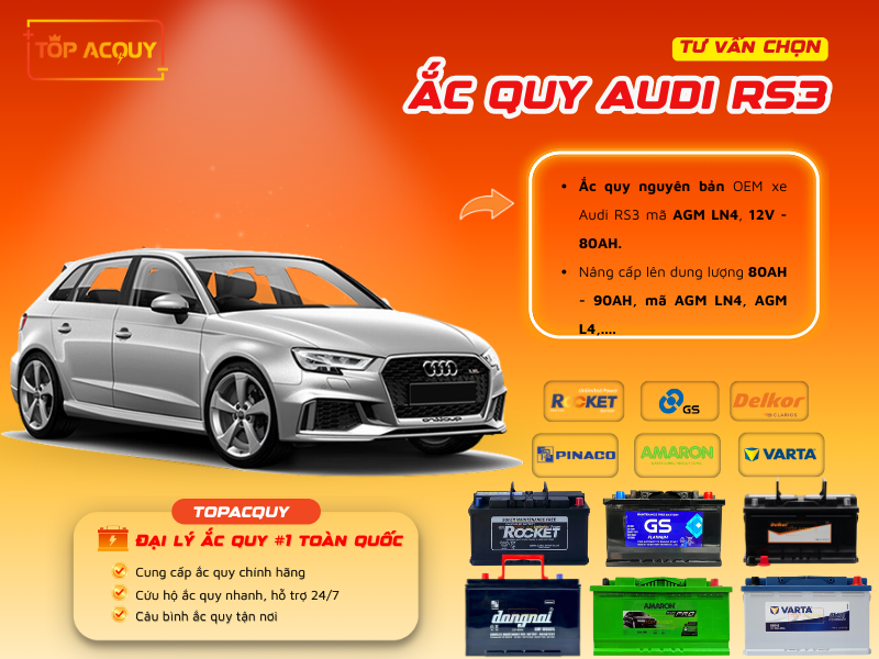 Để xe Audi RS3 của bạn luôn khởi động mạnh mẽ và vận hành ổn định, việc lựa chọn ắc quy chất lượng cao là yếu tố then chốt. TOPACQUY tự hào mang đến các sản phẩm chính hãng 100%, được nhập khẩu từ những thương hiệu hàng đầu thế giới như Varta, Delkor, Rocket, đáp ứng đầy đủ tiêu chuẩn khắt khe của một dòng xe thể thao hiệu suất cao.