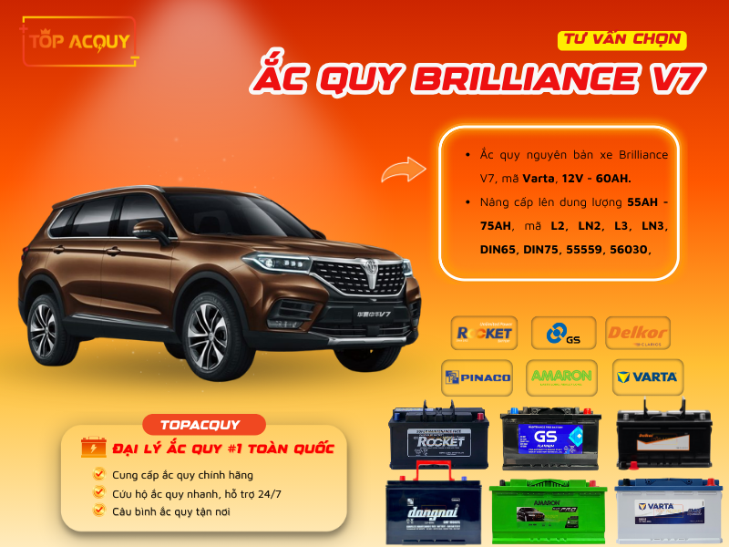 Tại TOPACQUY.VN, chúng tôi cung cấp đầy đủ các loại bình ắc quy Brilliance V7 chính hãng từ những thương hiệu hàng đầu như Varta, Delkor, Rocket, Amaron, GS... đảm bảo chất lượng, tuổi thọ cao cùng dịch vụ lắp đặt tận nơi chuyên nghiệp.