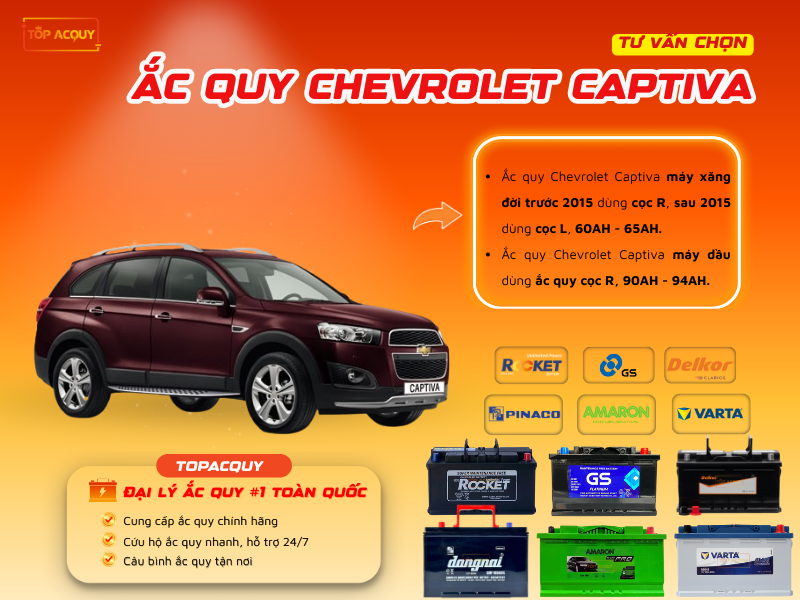 Để xe Chevrolet Captiva của bạn luôn khởi động mạnh mẽ và vận hành ổn định, lựa chọn ắc quy chất lượng cao là điều then chốt. TOPACQUY.VN tự hào mang đến các sản phẩm chính hãng 100%, nhập khẩu từ các thương hiệu uy như Amaron, Varta, Delkor, Rocket, GS, Atlas đáp ứng đầy đủ nhu cầu từ xe gia đình đến xe chạy dịch vụ.