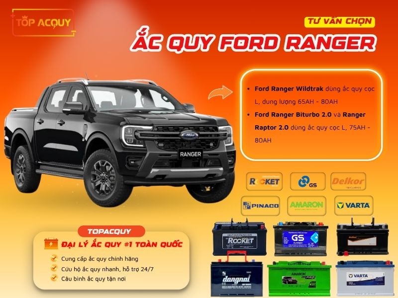 Việc thay ắc quy xe Ford Ranger tưởng chừng đơn giản nhưng thực tế lại đòi hỏi sự lựa chọn kỹ lưỡng. Chọn sai bình có thể khiến xe khởi động kém, nhanh hỏng hoặc phát sinh lỗi hệ thống điện. Tại TOPACQUY, bạn sẽ được tư vấn loại ắc quy phù hợp nhất cho Ford Ranger theo từng đời xe và phiên bản như bình ắc quy xe bán tải Ford Ranger, xe Ranger Wildtrak, xe Bi‑Turbo 2.0 hay xe Ranger Raptor. Chúng tôi cung cấp đa dạng sản phẩm từ các thương hiệu uy tín như Amaron, Rocket, Varta, Atlas, GS,… đảm bảo hiệu năng ổn định và tuổi thọ lâu dài.