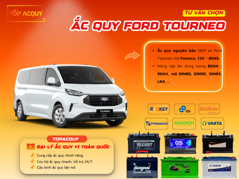 Tại TOPACQUY.VN, chúng tôi cung cấp đầy đủ các loại bình ắc quy Ford Tourneo chính hãng từ những thương hiệu hàng đầu như Varta, Delkor, Rocket, Amaron, GS... đảm bảo chất lượng, tuổi thọ cao cùng dịch vụ lắp đặt tận nơi chuyên nghiệp.
