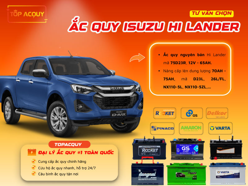 👉 Nếu Isuzu Hi Lander của bạn gặp vấn đề ắc quy hoặc cần thay mới, hãy liên hệ ngay Hotline: 0963.267.266. TOPACQUY cam kết sản phẩm chính hãng, giá tốt, dịch vụ chuyên nghiệp và nhanh chóng, giúp xe của bạn vận hành trơn tru, bền bỉ và an toàn.