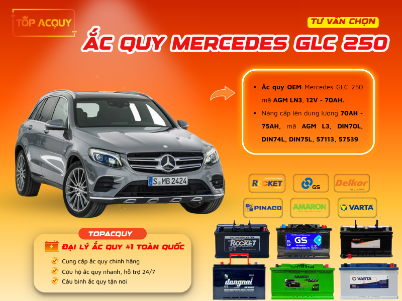 TOPACQUY – đơn vị chuyên cung cấp bình ắc quy xe Mercedes GLC 250, sẽ giúp bạn hiểu rõ thông số kỹ thuật, chọn đúng loại bình AGM phù hợp và hướng dẫn dịch vụ thay tận nơi, cứu hộ 24/7 chuyên nghiệp nhất hiện nay.