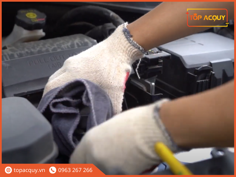 Bước 7: Vệ sinh bụi bẩn bám trong khay đựng bình ắc quy.