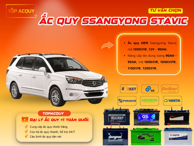 Tại TOPACQUY.VN, chúng tôi đã tổng hợp các dòng ắc quy hàng đầu, đảm bảo cung cấp dòng khởi động mạnh mẽ và tuổi thọ bền bỉ cho Ssangyong Stavic.