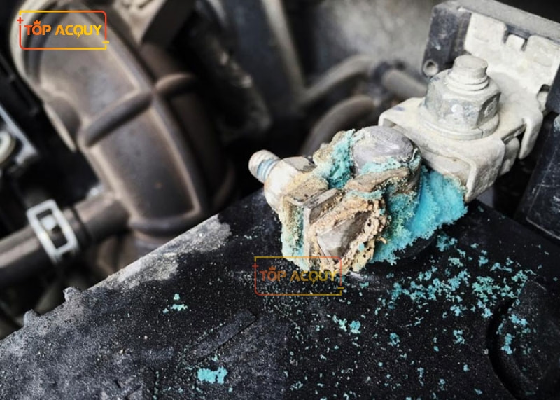 - Đầu cọc bình ắc quy có bám muối trắng hoặc rêu xanh