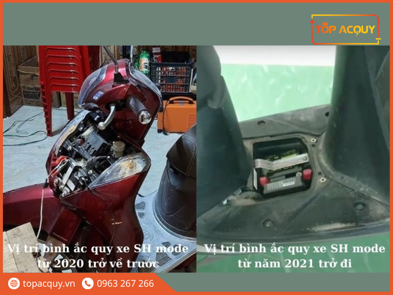 Đời xe SH mode từ năm 2020 về trước và 2021 trở về sau có vị trí đặt bình ắc quy khác nhau, cụ thể như sau: