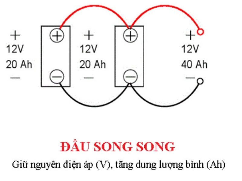 Khi lựa chọn cách đấu nối bình ắc quy này, điện áp (V) của bình ắc quy vẫn được giữ nguyên, chỉ có dung lượng (Ah) của bình tăng lên n lần sau khi đấu nối. Cụ thể, nếu bạn tiến hành đấu nối song song hai bình ắc quy có thông số mỗi bình là 12V-12Ah thì bạn sẽ nhận được hệ thống với điện áp không đổi là 12V còn tổng dung lượng thì sẽ tăng lên 12 x 2 = 24Ah.