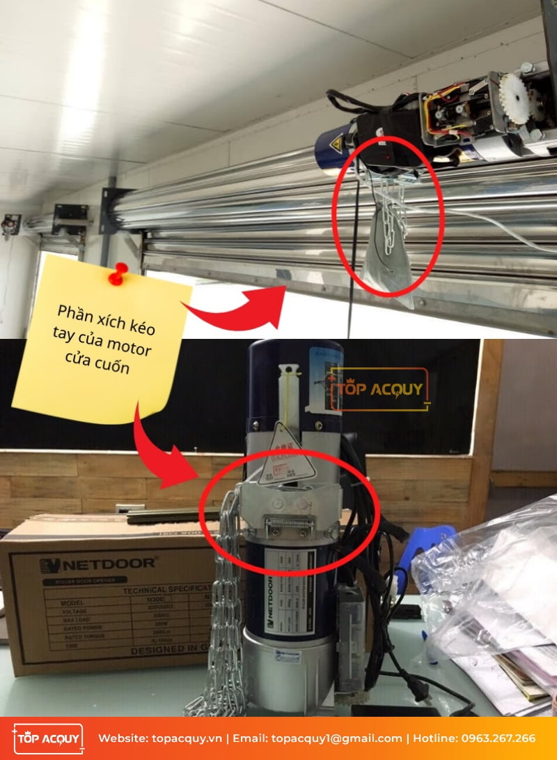 Cách mở cửa cuốn khi mất điện này tương đối đơn giản, bạn chỉ cần tìm vị trí đặt động cơ cửa cuốn rồi thả xích xuống theo phương thẳng đứng. Vì dây xích có hai chiều, nếu muốn mở cửa bạn kéo từ từ dây xích thì cửa cuốn sẽ dần được đẩy lên.
