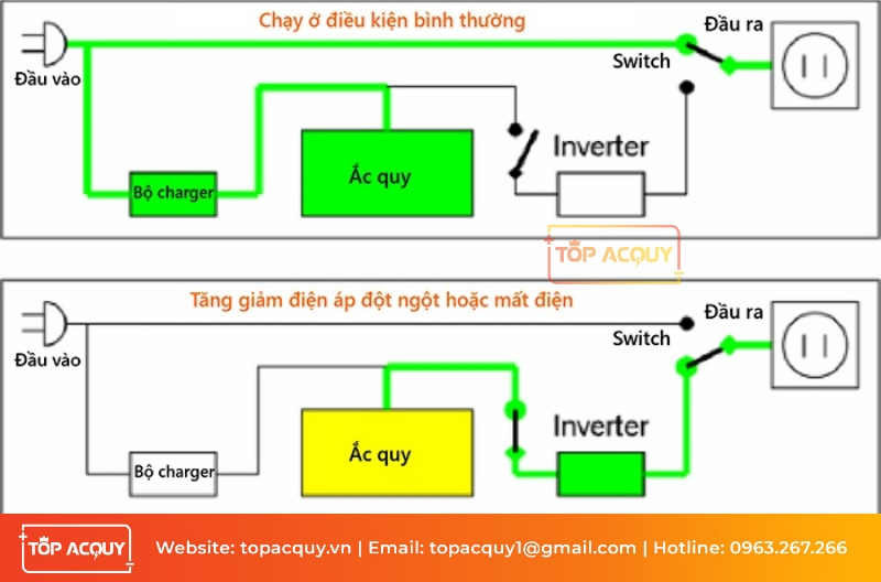 - Trong trường hợp điện lưới kém ổn định hoặc cúp điện thì bộ lưu điện UPS sẽ chuyển sang hoạt động trong chế độ ắc quy, chuyển từ nguồn điện 1 chiều DC thành dòng điện xoay chiều AC và cấp cho thiết bị tải điện.